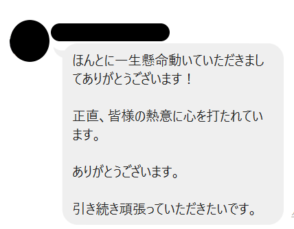 - 事務長と2人では絶対にできなかった様々な対応をして下さってありがとうございます。